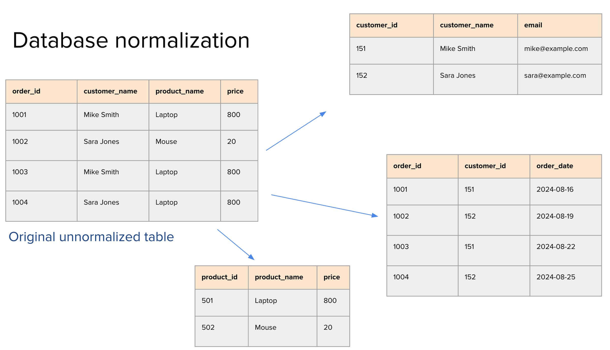 Imagine a table that records customer orders. It has four columns: order_id, customer_name, product_name, and price. Right away, you can spot inefficiencies. "Mike Smith" shows up more than once, and so does the product "Laptop." This redundancy means updates (e.g., changing Mike’s email or updating a laptop’s price) have to be made in multiple places, increasing the risk of inconsistency.