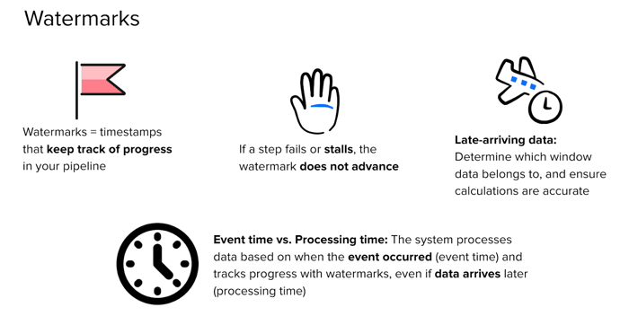In short, watermarks help Dataflow stay aligned with the real sequence of events, allowing for accurate, consistent stream processing—even when data shows up late or out of order.